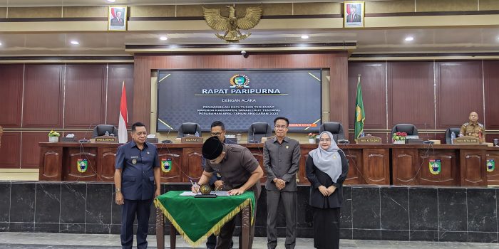 Bupati Tanahlaut H. Rahmat Trianto, dan Wakil Bupati H. Muhammad Zazuli, bersama Ketua DPRD H. Khairil Anwar dan dua wakil ketua DPRD, menandatangani bersama dokumen kesepakatan perubahan APBD 2025.