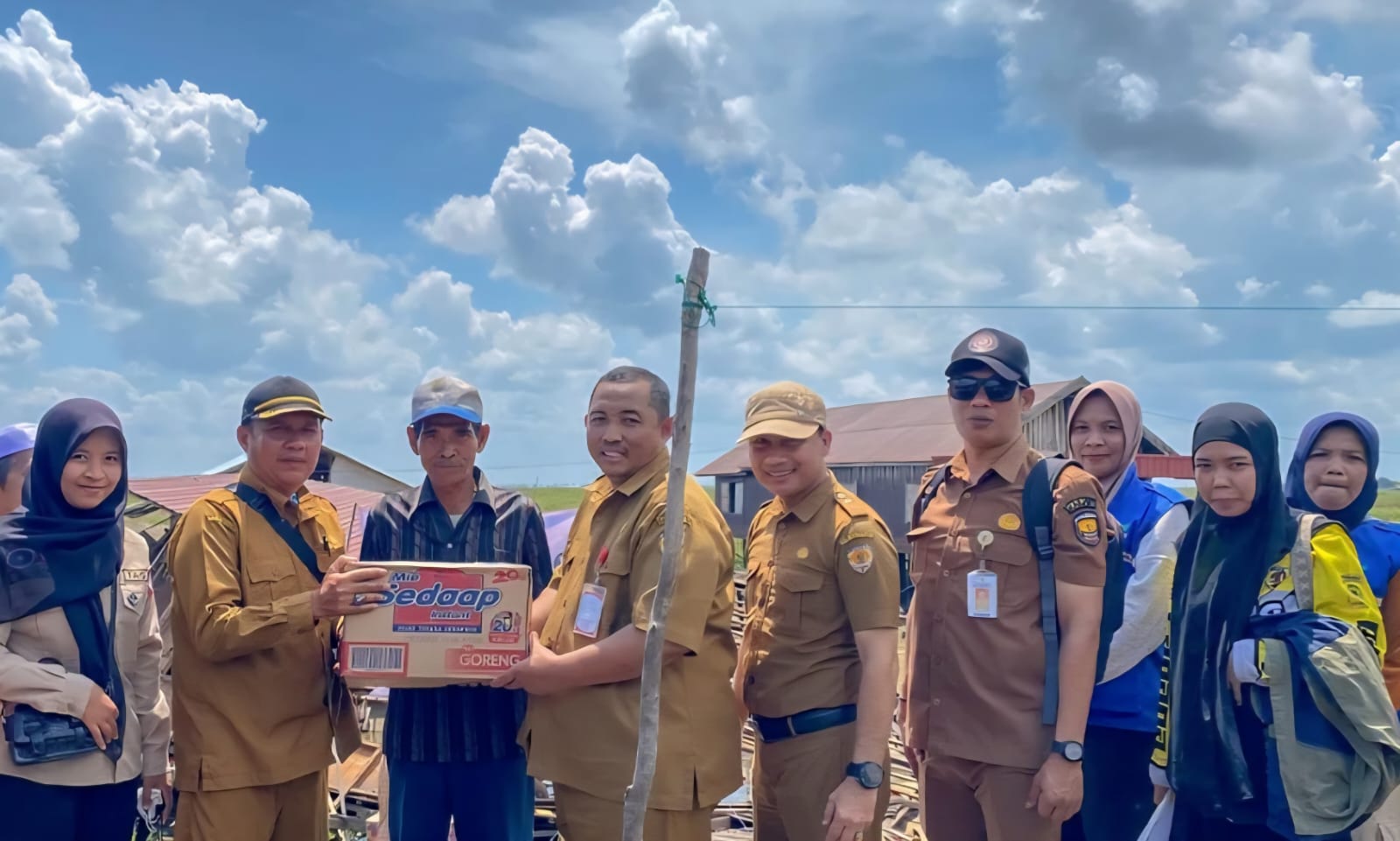 Penyerahan bantuannya melalui Dinas Sosial Pengendalian Penduduk Keluarga Berencana Pemberdayaan Perempuan dan Perlindungan Anak (PPKB PPPA) bersama camat, aparat desa, serta relawan Taruna Siaga Bencana (Tagana) HST.