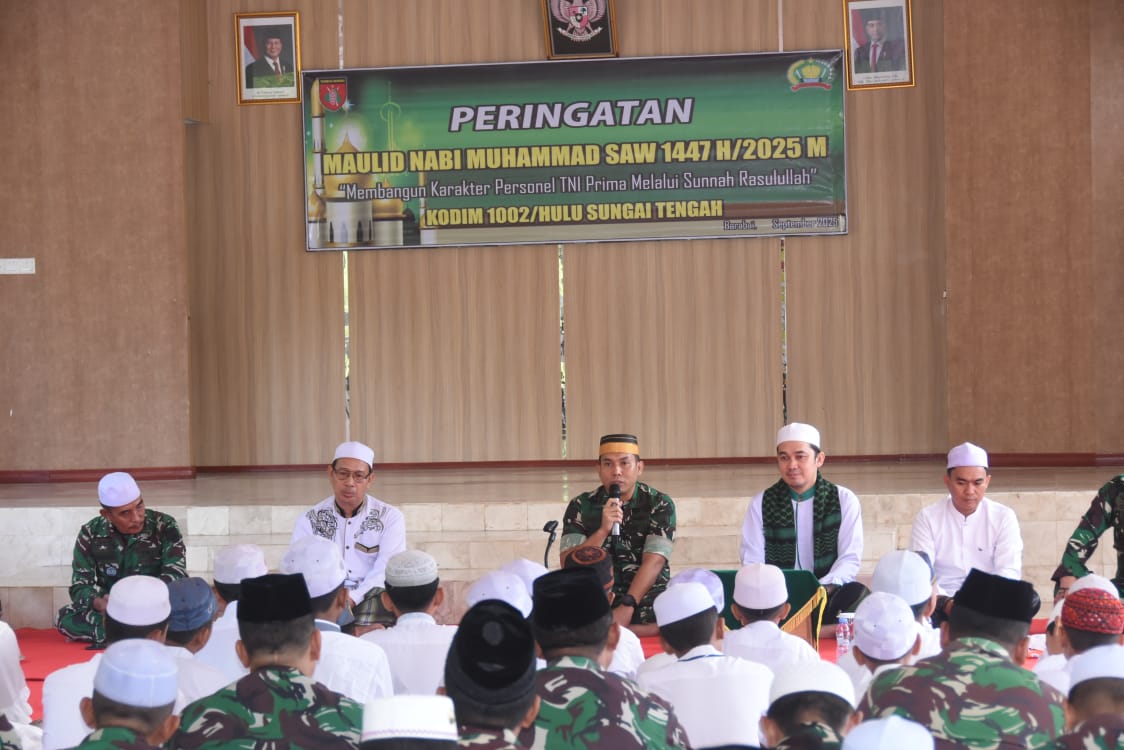 Dalam sambutannya, Dandim 1002/HST menegaskan peringatan Maulid Nabi bukan sekadar seremonial tahunan, tetapi momentum penting untuk meneladani akhlak Rasulullah SAW.