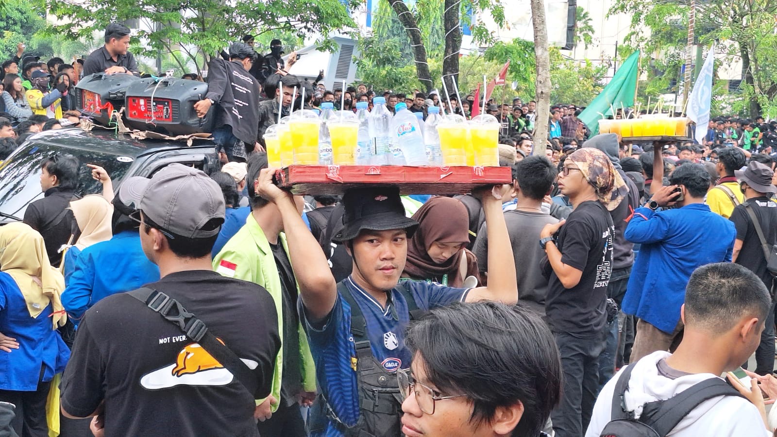 Dengan semangat pantang menyerah, ia membuktikan bahwa perjuangan mencari nafkah bisa dilakukan di mana saja—bahkan di tengah gelombang protes.