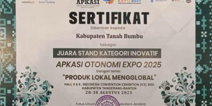 KALSELMAJU.COM, BATULICIN – Kabupaten Tanahbumbu berhasil meraih penghargaan Stand Kategori Inovatif pada gelaran Apkasi Otonomi Expo (AOE) 2025. Acara berlangsung di Indonesia Convention Exhibition (ICE) BSD, Tangerang, pada 28–30 Agustus 2025.