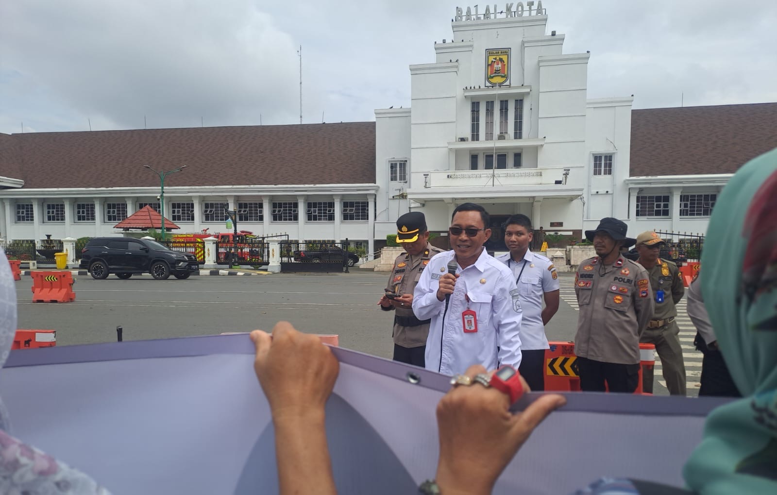 Sekretaris Daerah Banjarbaru, Sirajoni, yang turun langsung menemui massa aksi, menjelaskan bahwa Wakil Wali Kota Banjarbaru tidak bisa hadir karena sedang menjalani pemeriksaan kesehatan rutin.