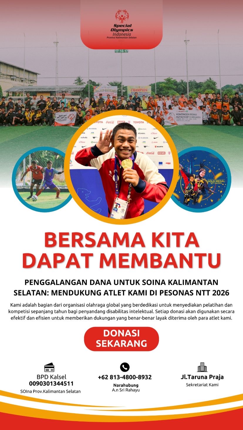 KALSELMAJU.COM, BANJARMASIN – Special Olympics Indonesia (SOIna) Kalimantan Selatan membuka penggalangan dana dari masyarakat untuk mempersiapkan 58 atlet menghadapi Pekan Special Olympics Nasional (PESONAS) 2026 di Nusa Tenggara Timur. Langkah ini diambil karena hingga kini belum tersedia anggaran hibah dari pemerintah daerah.