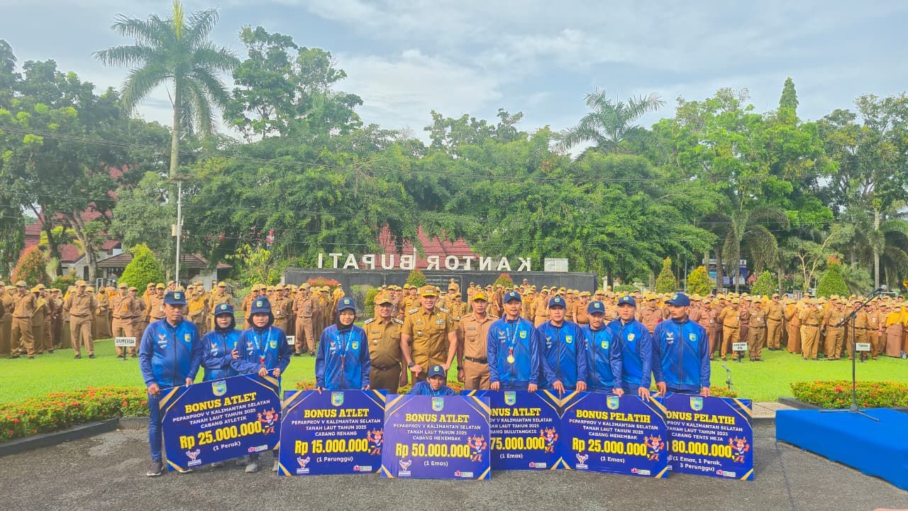 Penyerahan bonus berlangsung di halaman Kantor Bupati Pelaihari, Senin (2/3/2026), sekaligus mengakhiri penantian para atlet setelah proses penganggaran daerah rampung.