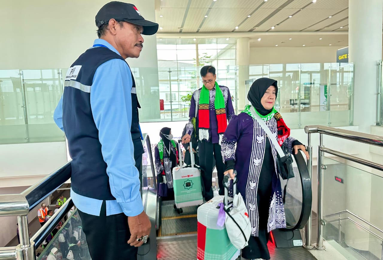 Calon Jemaah Haji Embarkasi Banjarmasin tahun lalu saat memasuki Bandara Syamsudin Noor. Foto : Antaranews.com