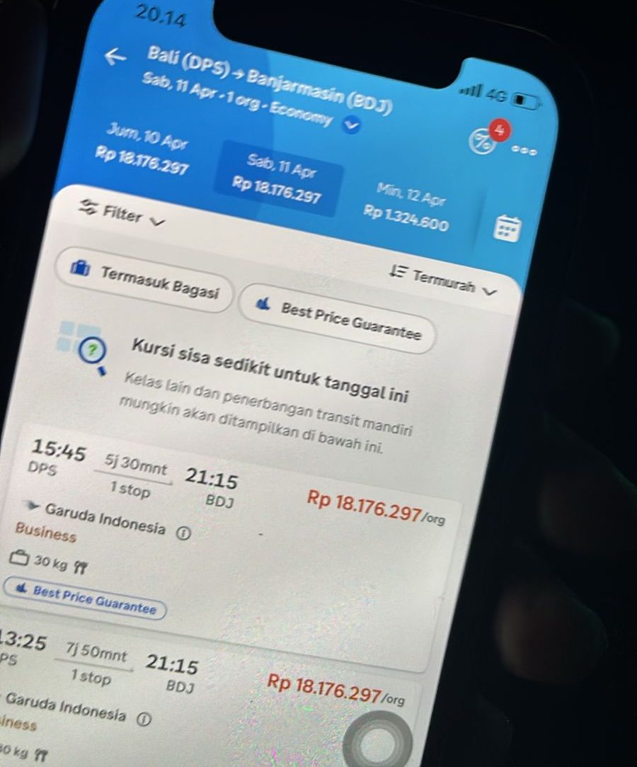 Saking kagetnya, wanita bernama Tiwi, warga Banjarmasin hampir syok sembari mengelus dada. Betapa tidak, harga tiket yang tertera untuk penerbangan tanggal 11 April 2026 sebesar Rp18.176.297.